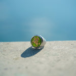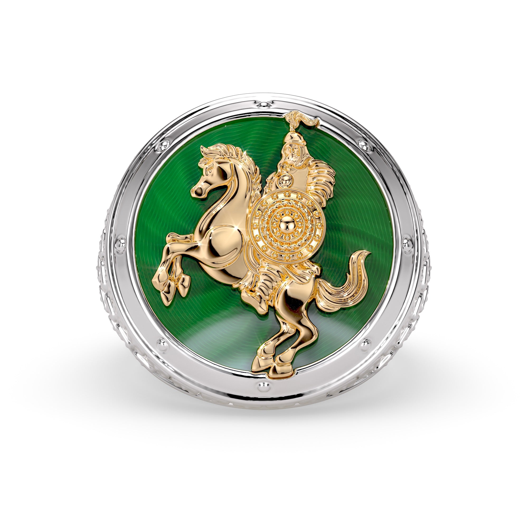 mens 18ct white and yellow gold ring featuring mongolian horse warrior and green guilloché enamel